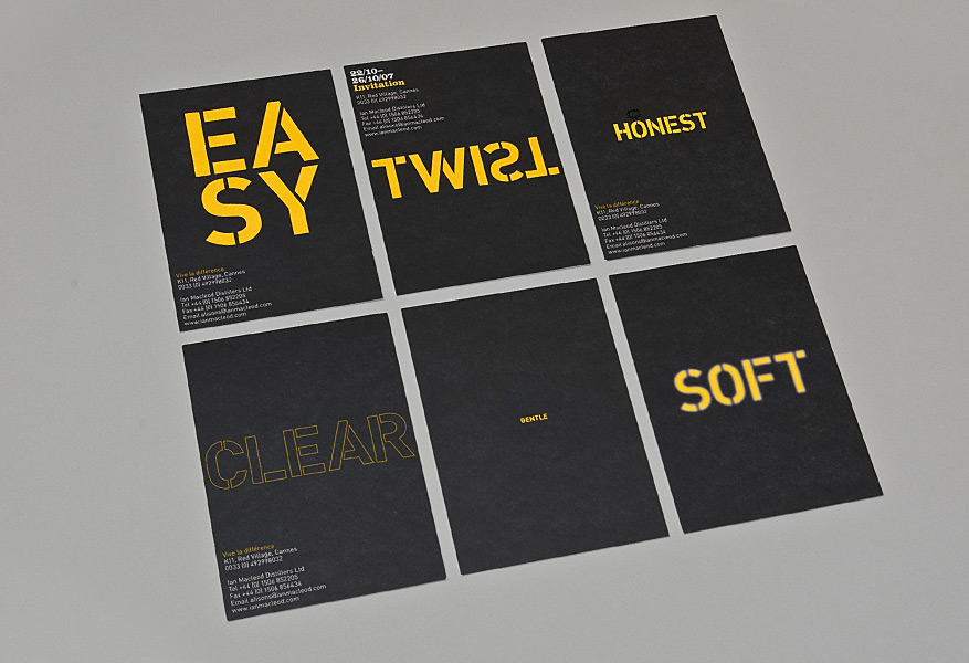 Taking the letterpress look of Smokehead and the stenciled look of Burnfoot, I used a series descriptive words with antonymic meanings juxtaposed on opposites sides of the cards. The first two cards only carried a date, the third was the invite and the remaining three had more details on. These were sent out to people over a series of weeks.